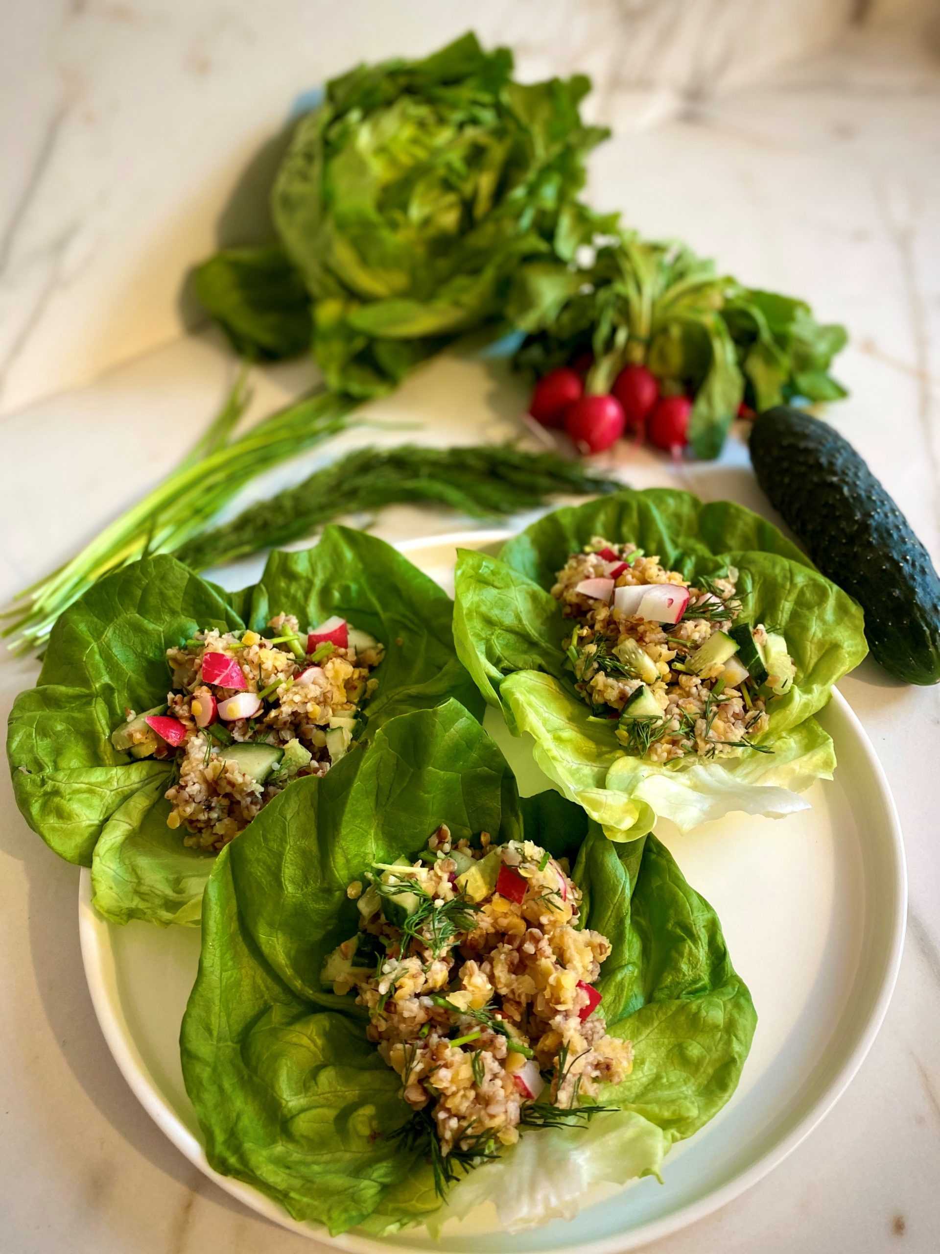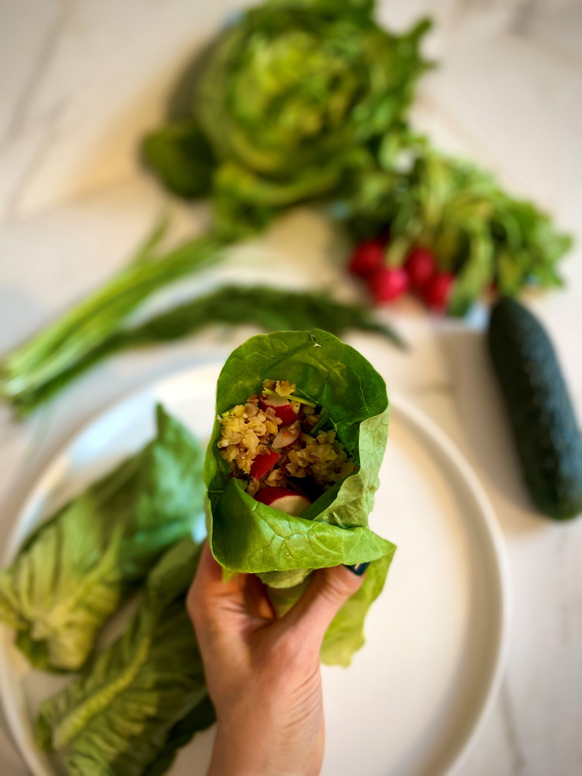 Kasza gryczana z soczewica i nowalijkami na młodej sałacie/we wrapie z sałaty